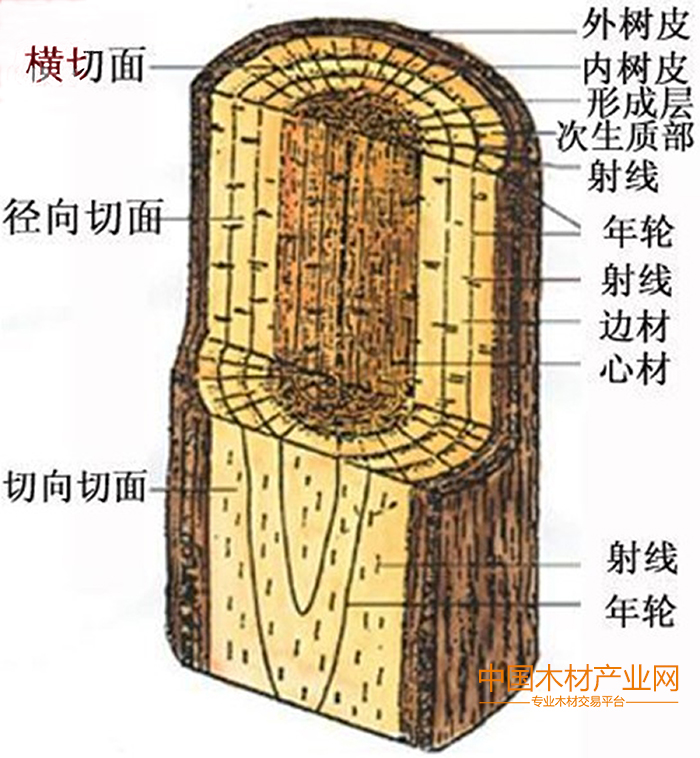 横切面是指与树干主轴相垂直的切面,变即树干的端面,可用来观察各种轴向分子的横断面和木射线的宽度,它是识别木材最重要的一个切面。
