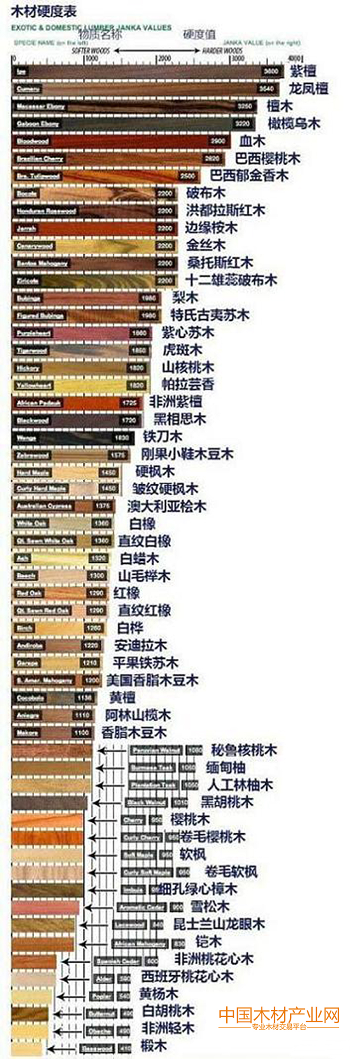 下图是一张在pinterest看到一张很形象的木材硬度表,译成了中文,知识贴欢迎收藏。可以看到木材硬度排在前三位的紫檀、龙凤檀、和檀木。木材硬度最低的为非洲轻木和椴木。