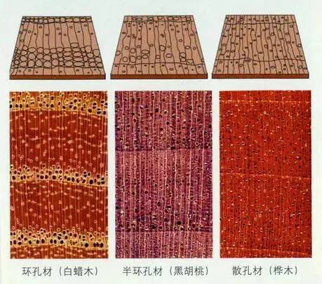 环孔材:木材的早材孔明显大于前一生长轮和同一生长轮的晚材管孔,并形成明显的带状或环状。如白蜡木、水曲柳。